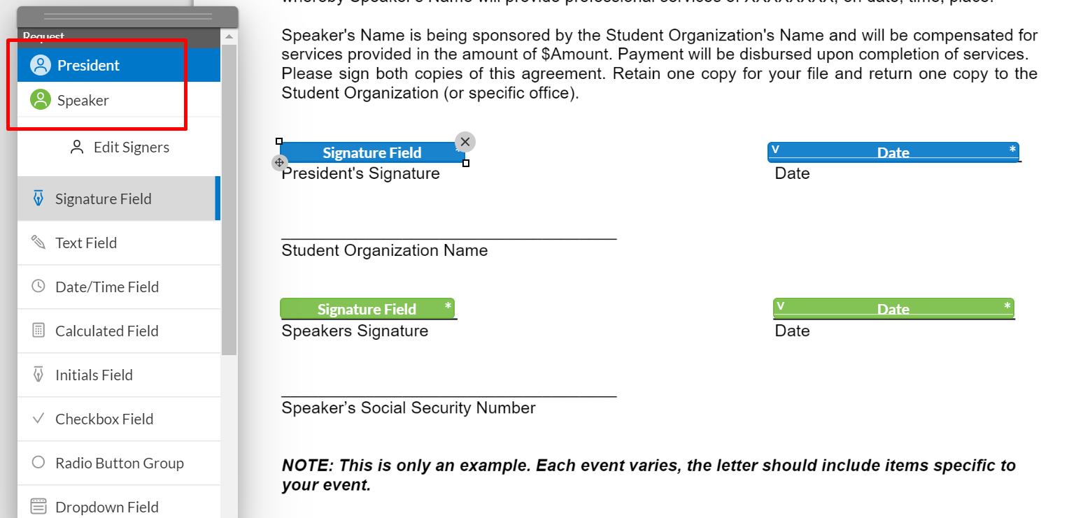 { t (for Type of field): s (for Signature); r (for Required): y (for Yes); o (for Role): “Customer”;}